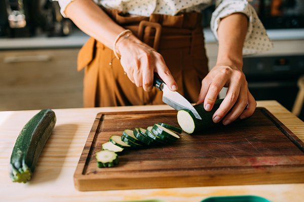 - Кабачки нарежьте вдоль пластинами толщиной не больше четырех миллиметров.