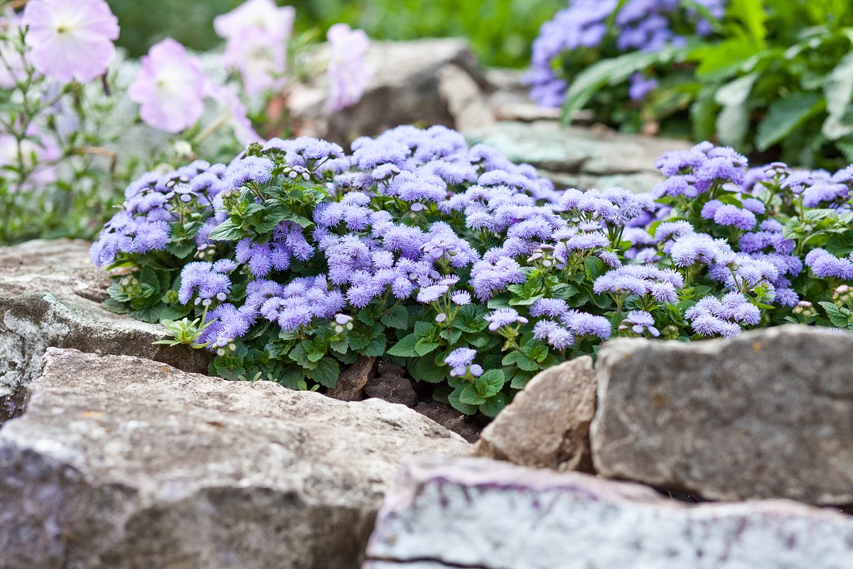 Агератум используется в ландшафтном дизайне для создания ярких ковровых цветников, в обрамлении бордюров, клумб, альпийских горок и рабаток. Карликовые сорта отлично смотрятся в вазонах и контейнерах. Эти цветы гармонично сочетаются с сальвией, календулой, бархатцами, вербеной, гелениумом, однолетними флоксами, львиным зевом, рудбекией и гацанией, образуя живописные композиции.