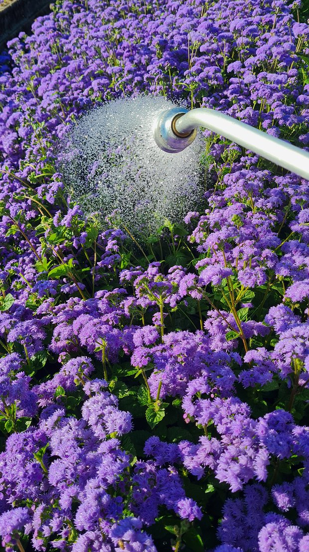 Агератум требует регулярного полива, особенно в жару. При этом поливать растение нужно строго под корень, избегая попадания на листья и соцветия, чтобы не спровоцировать развитие грибковых заболеваний или пятнистости.