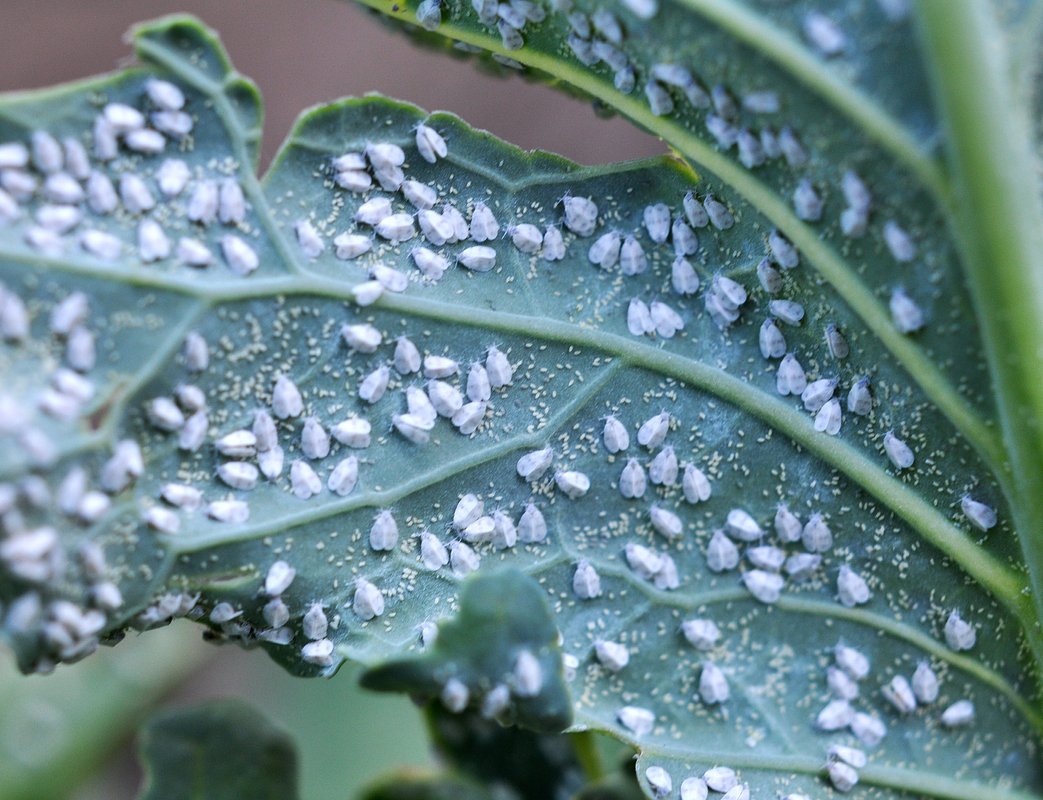 Белокрылка оставляет на листьях агератума белый налет. Это мелкое насекомое высасывает соки растения, что приводит к его усыханию и гибели.