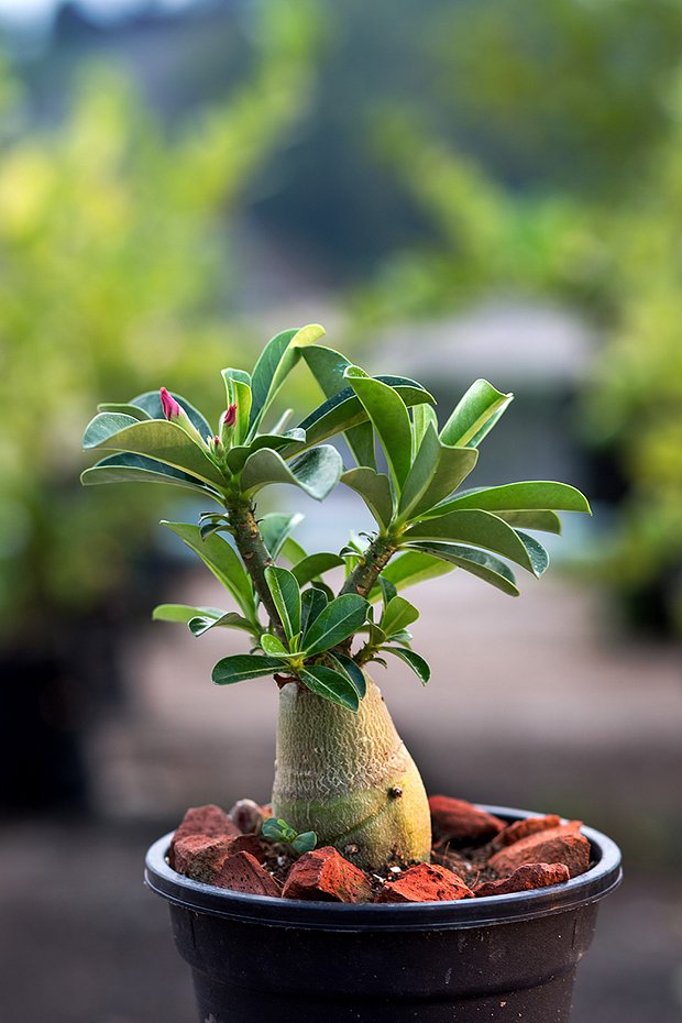 Для адениума, растущего в оптимальных условиях, лучше всего подходят бедный питательными веществами грунт и регулярные подкормки. Такие условия более приближены к природным и обеспечивают активное развитие каудекса — утолщения в основании ствола.