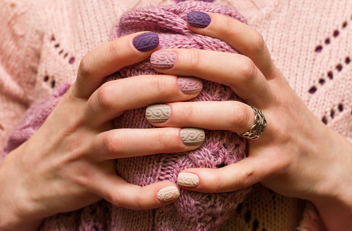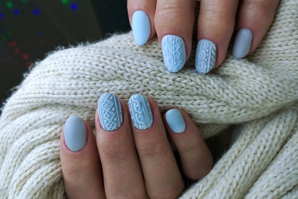 Зимой особенно актуальным становится так называемый «вязаный» маникюр, напоминающий по фактуре теплый вязаный свитер. Оригинальный дизайн идеально гармонирует с холодной погодой. Достигается такой эффект за счет специальных гель-лаков с текстурным покрытием или прорисовки тонких «петелек» кистью, часто в сочетании с глубокими бордовыми, теплыми бежевыми или ледяными голубыми оттенками.
