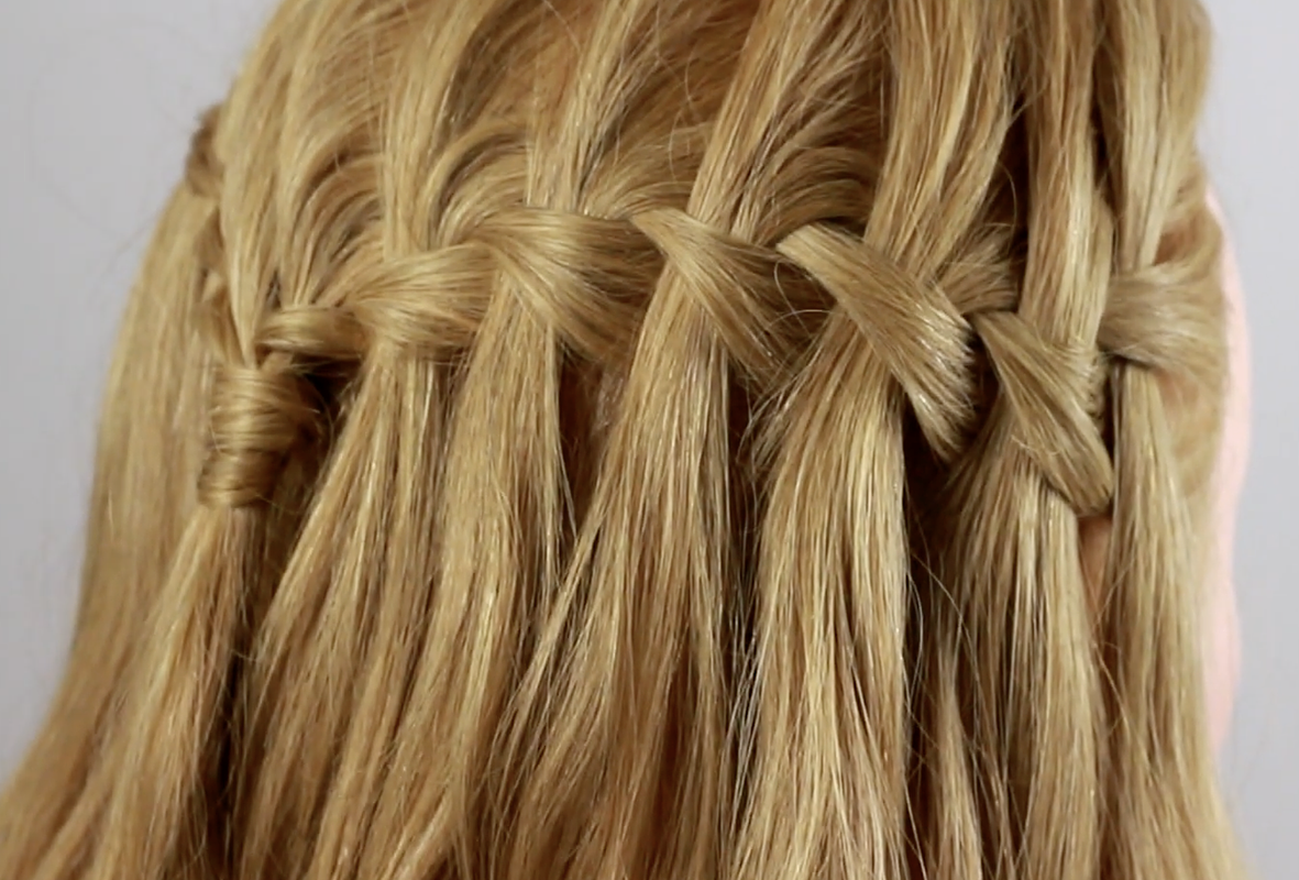 - Сплетите небрежную французскую косу от виска, но вместо того чтобы вплетать все нижние пряди, выпускайте их вниз, создавая эффект «водопада».