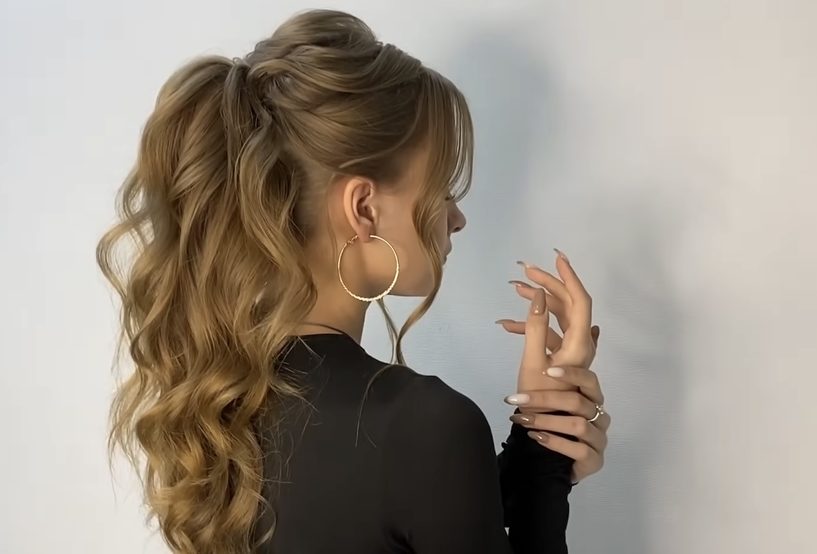 - Соберите волосы в высокий хвост. Если хотите больше объема, завейте хвост крупными локонами или пройдитесь по нему утюжком для гофре.