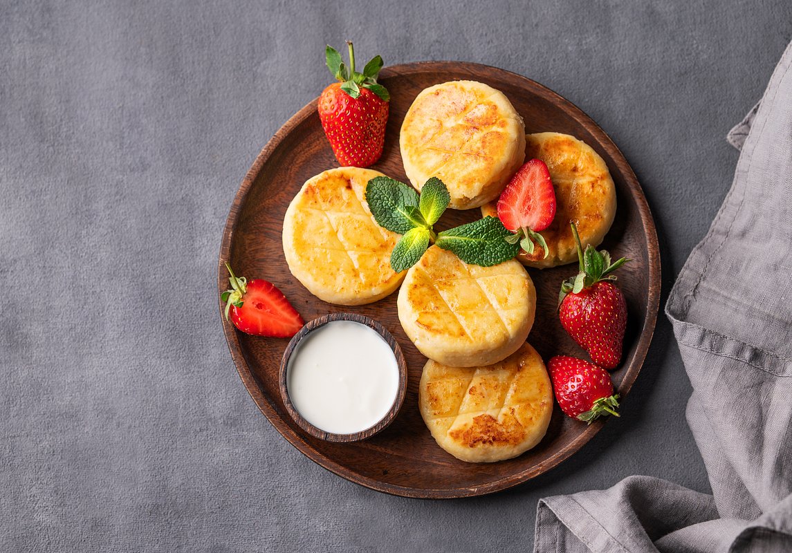 - Затем добавьте просеянную муку. Чтобы сырники получились ровными, используйте сухой чистый стакан: накройте им сформированный руками и обсыпанный мукой сырник и, держа за донце, вращайте по кругу. Обжарьте сырники на сливочном или растительном масле — на это уйдет не более 15 минут.