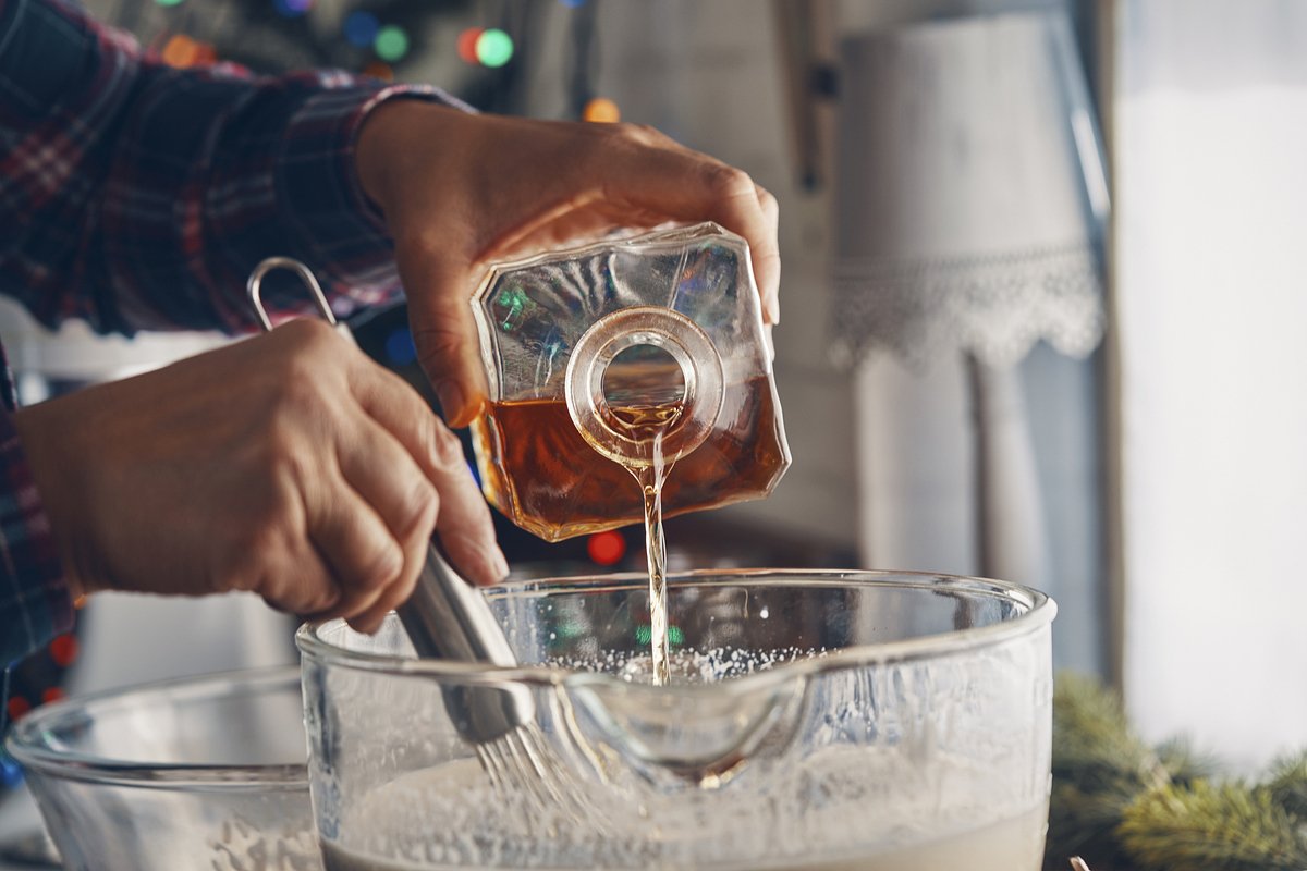 - с крепким алкоголем — темным ромом, коньяком, виски или ликером.