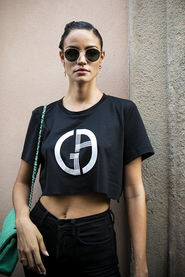 Сейчас подобную футболку можно сочетать со свободными джинсами на высокой талии и асимметричными юбками. К образу можно добавить аксессуары с кристаллами и чокер — это точно вернет вас в эпоху Y2K.