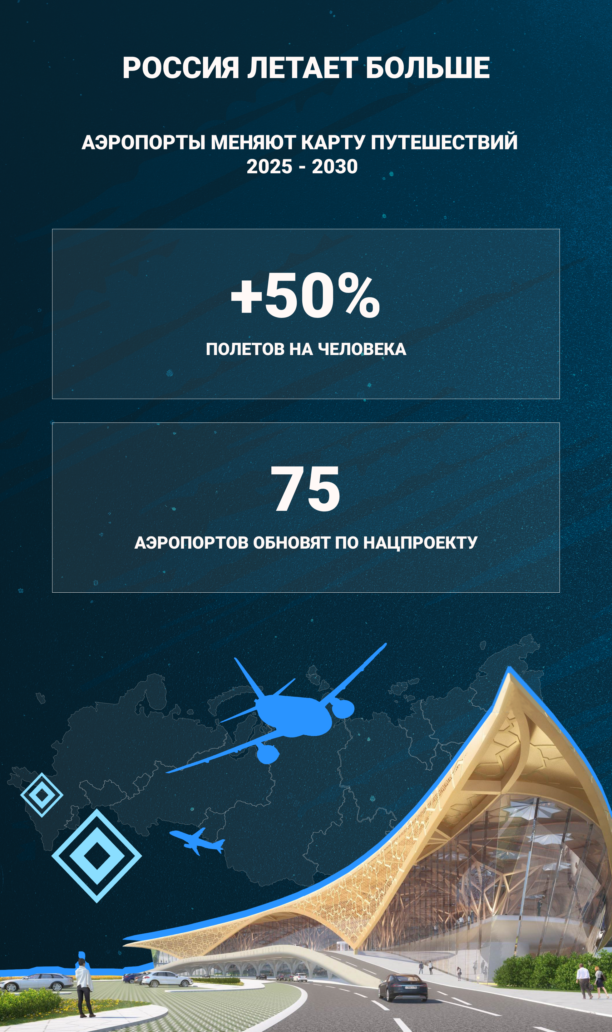 09:15, 1 декабря 2025К 2030 году среднее число полетов на одного жителя страны планируется увеличить на 50 процентов. Для достижения этой цели по нацпроекту «Эффективная транспортная система» в том числе проводится модернизация инфраструктуры аэропортов.
