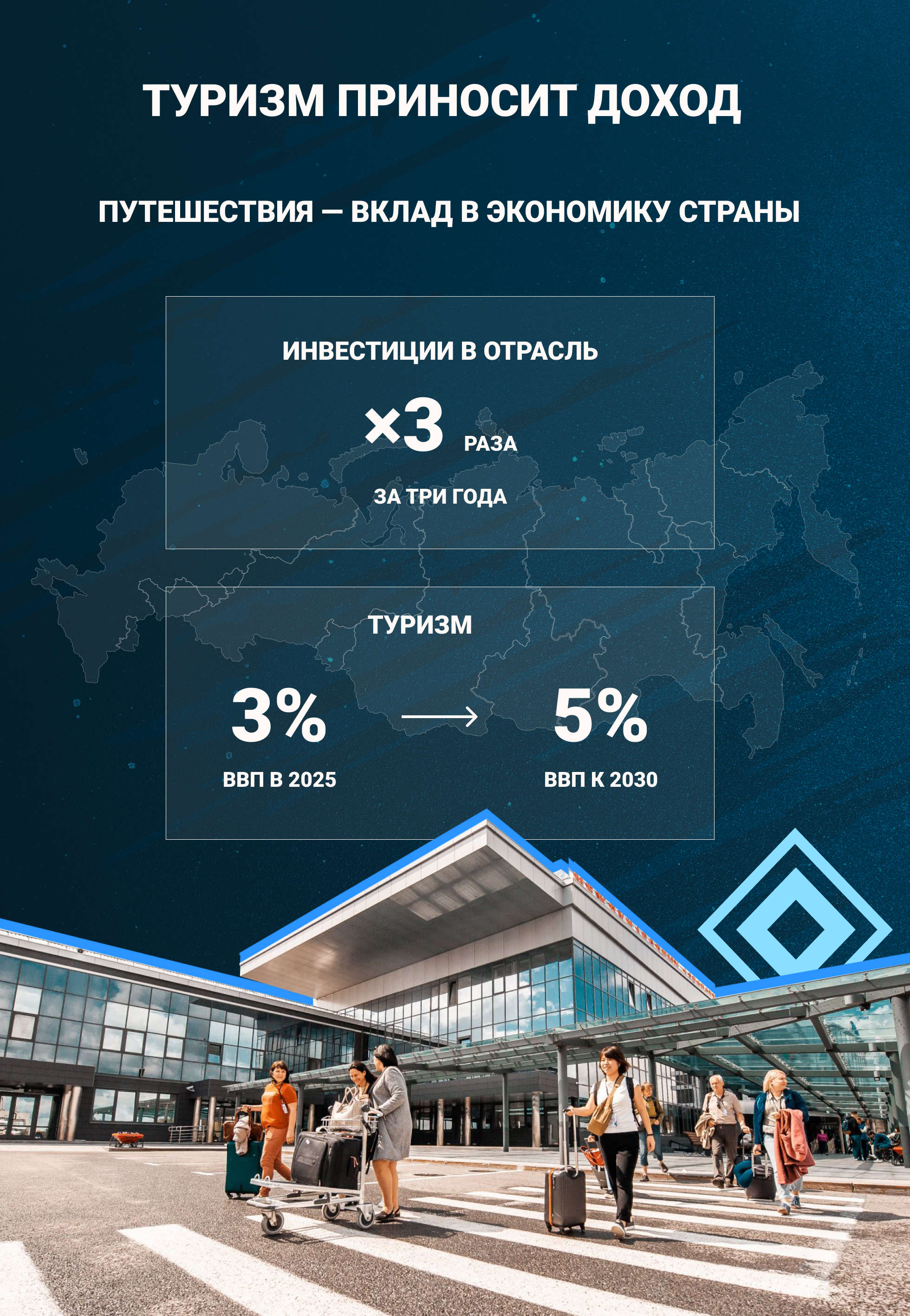 К 2030 году число поездок по России должно достичь 140 млн, а доля туристической отрасли в ВВП — 5 процентов. И это не просто слова. По данным Минэкономразвития, за последние три года объем инвестиций в туристическую отрасль страны вырос в три раза.