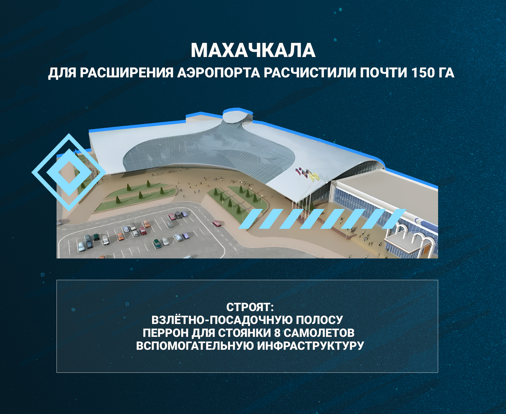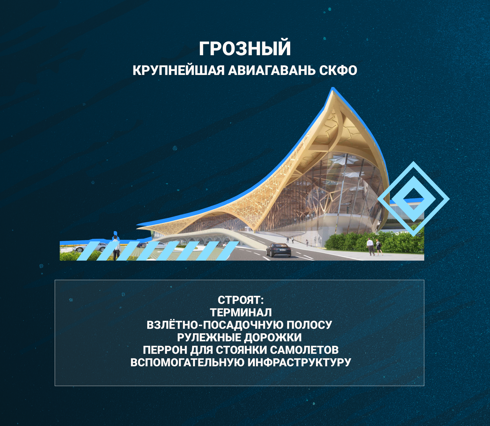 Так, в Грозном строится новый терминал аэропорта в форме полумесяца. Он станет одной из новых достопримечательностей региона. Параллельно обновляют и инфраструктуру воздушной гавани: строят новую взлётно-посадочную полосу, которая спроектирована с учётом сейсмических норм, рулежные дорожки и перрон для стоянки самолетов.