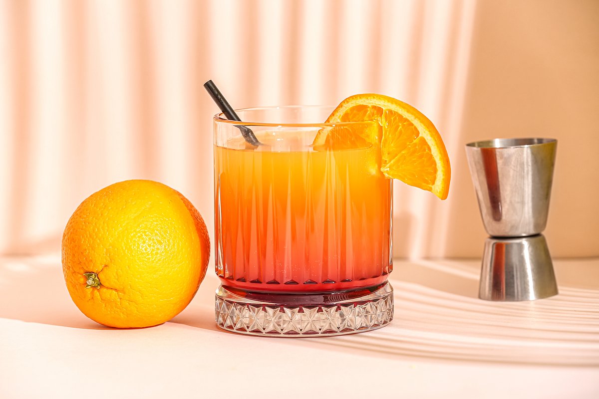 - Добавьте апельсиновый биттер сверху, а потом аккуратно наслоите темный ром поверх всего коктейля — он задержится сверху и не сразу смешается с напитком.