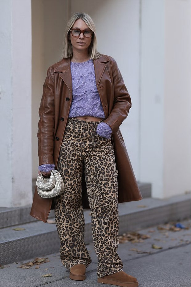 Еще один необычный, но стильный образ, который больше подойдет для осени и теплой зимы — кожаный коричневый тренч в сочетании с джинсами с принтом леопарда или коровы в таких же оттенках и угги. В качестве цветовых акцентов можно использовать яркие аксессуары, например сумку и свитер или худи в лавандовом оттенке.