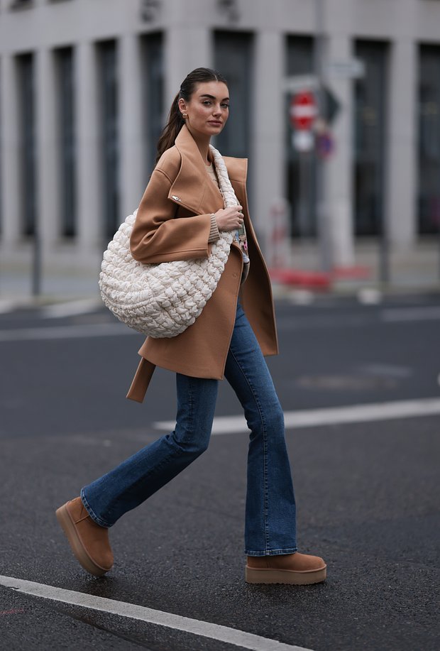 Джинсы Bootcut, которые плотно облегают бедра и расширяются к низу, идеально подходят к женственному образу с уггами карамельного цвета. Чтобы не скрывать изящные пропорции ног за длинными объемными вещами, лучше отдать предпочтение полупальто песочного цвета. Отличным дополнением к такому луку станет стеганая объемная сумка.