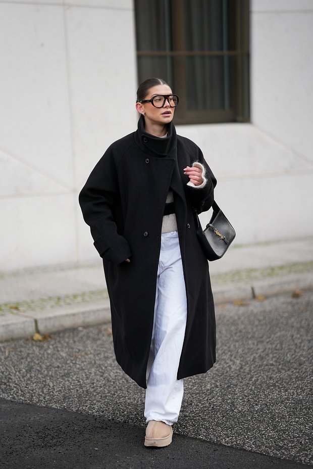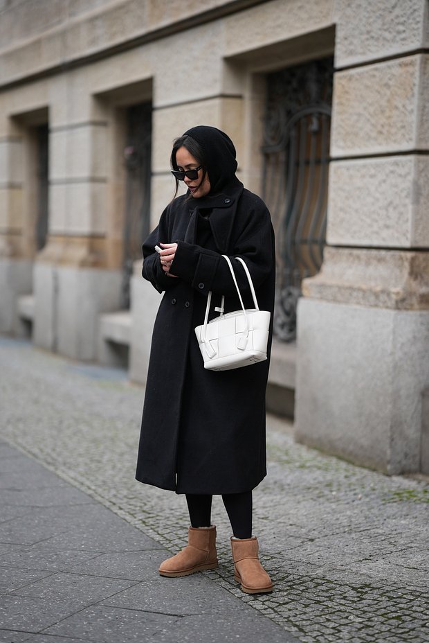 К объемным уггам следует выбирать облегающие шапки-бини, чепчики или береты — они уравновесят силуэт. От массивных головных уборов с помпонами лучше отказаться, так как они, наоборот, будут утяжелять образ. Исключением в этом случае может стать спортивный образ с пуховиком, где крупная шапка будет уместна.