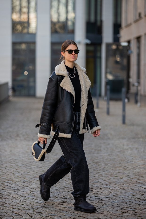 Утепленная кожаная куртка + темные джинсы + угги