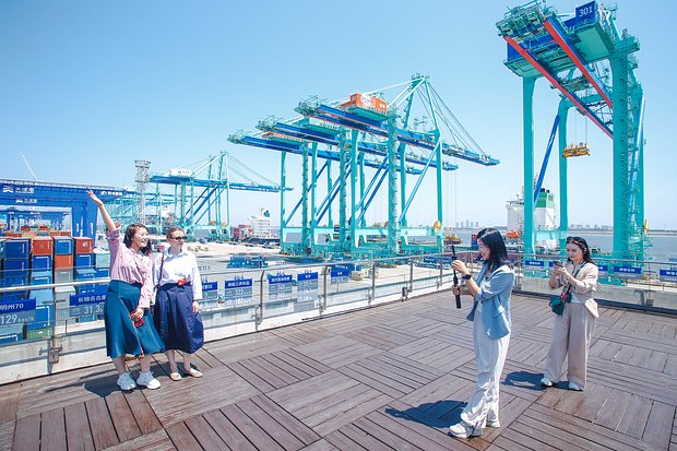 Гости позируют для фотографии у интеллектуального терминала с нулевым уровнем выбросов в порту Тяньцзинь