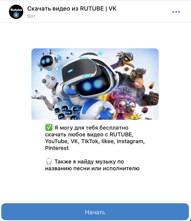 Существуют боты, которые позволяют скачивать видео из YouTube, «ВКонтакте», Rutube и других источников. Официальных ботов у видеохостингов нет, а существующие могут перестать работать в любое время, попав под волну блокировки. Кроме того, некоторые боты просят пользователей подписаться на сторонние, не всегда безопасные каналы, где могут публиковаться вредоносные ссылки. Не переходите по сторонним ссылкам и не вводите свои личные данные, а если бот требует это сделать, прекратите им пользоваться.