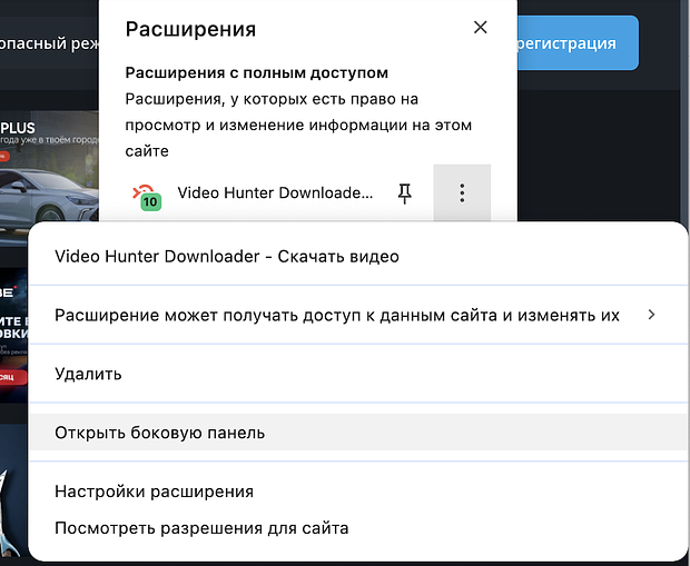4. Некоторые расширения позволяют скачать видео в один клик — достаточно лишь нажать на значок загрузки, который появится у ролика. Однако некоторые сервисы нужно активировать. Для этого перейдите в раздел «Расширения» и нажмите на нужную программу, а затем выберите размер и качество видео и кликните на кнопку «Загрузка» или Download.