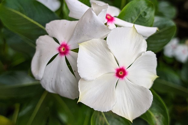 - Цветки — главное украшение катарантуса. Они одиночные, до трех-пяти сантиметров в диаметре, с пятью гладкими лепестками характерной колесовидной формы, что делает их похожими на флоксы. Классическая окраска — розовая, с контрастным глазком в центре, но у современных сортов более богатая палитра — от белоснежного до пурпурного оттенка.