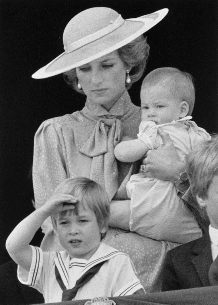 Этот снимок был сделан за месяц до того концерта: принц Уильям отдает честь, наблюдая с балкона Букингемского дворца в Лондоне за церемонией выноса знамени. Рядом с ним — принцесса Диана, держащая на руках принца Гарри.