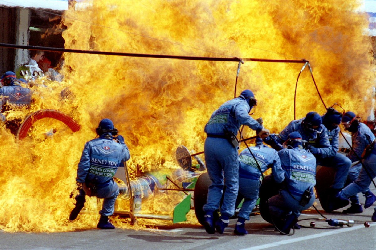 Этот кадр мог стать одним из самых трагичных в истории спорта, но по счастливой случайности обошлось без жертв. Во время дозаправки на гран-при «Формулы-1» в Германии 31 июля 1994 года загорелся автомобиль пилота Йоса Ферстаппена.