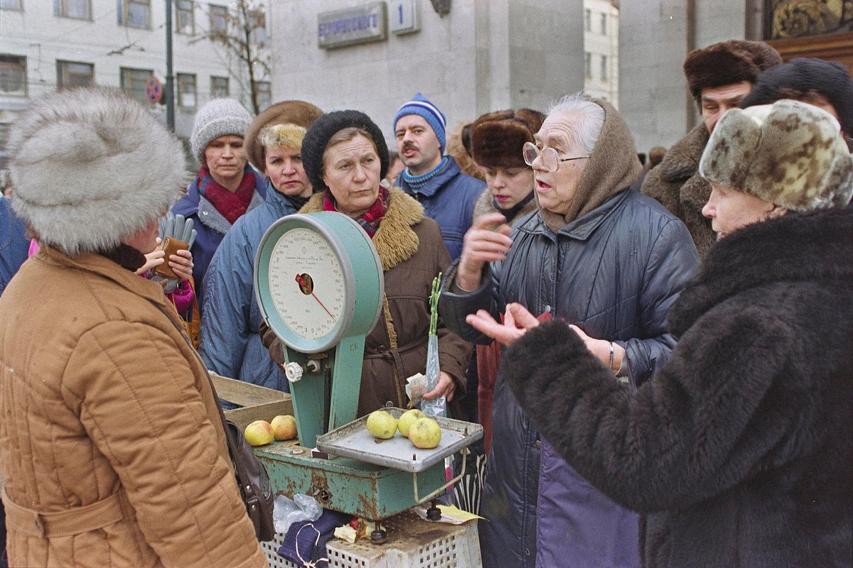 Увенчал закат европейского социализма распад СССР, за которым последовало становление новой России. Этот снимок был сделан в феврале 1992 года возле одного из продуктовых магазинов Москвы, посетители которого спорили о цене яблок. Первое десятилетие жизни нового государства оказалось непростым: политические и экономические потрясения сопровождались высоким уровнем бедности, безработицы и преступности, а пустые полки стали одной из примет тяжелого периода.