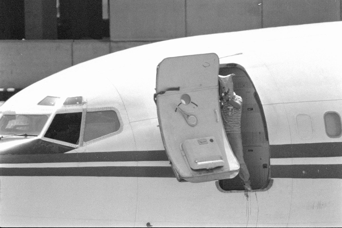 Вооруженный мужчина с мешком на голове, стреляющий из автоматической винтовки на этом фото, — один из террористов, захвативших в июне 1985 года следовавший из Афин в Рим Boeing 727 авиакомпании Trans World Airlines. Снимок сделан 20 июня в Бейруте, где сел борт. Террорист ведет огонь по группе фотографов, расположившихся на балконе с видом на самолет.