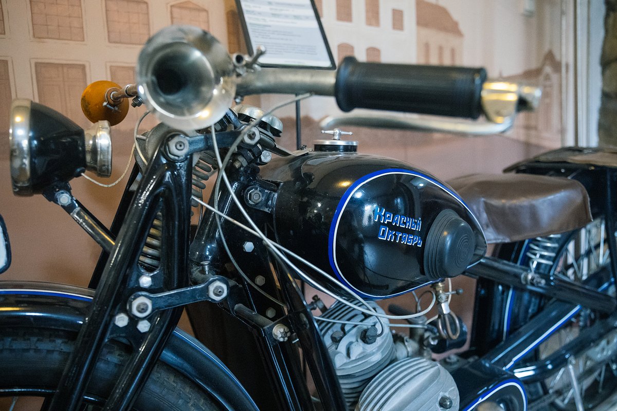 Рядом — первый советский серийный мотоцикл Л-300 «Красный Октябрь». Л — означает Ленинград, 300 — объем двигателя 300 кубических сантиметров. Расход топлива 1 литр на 100 километров, запас хода 295 километров. Мощность 6,5 лошадиных сил, вес 125 килограммов. Выпускался с 1933 по 1938 год.