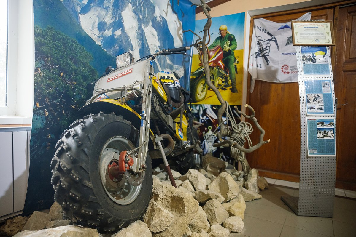 Доказательством уникального достижения служит находящийся здесь же диплом Книги рекордов России о «первом полностью официально подтвержденном восхождении на мотоцикле на высшую точку Европы — восточную вершину горы Эльбрус (высота 5621 метр)».