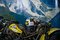 В следующем небольшом зале внимание сразу привлекает объемно-пространственная композиция. Инсталляция на фоне заснеженных гор состоит из каски, ледоруба и груды валунов, на которую взобрался весьма необычный мотоцикл с широкими шипованными покрышками колес.
