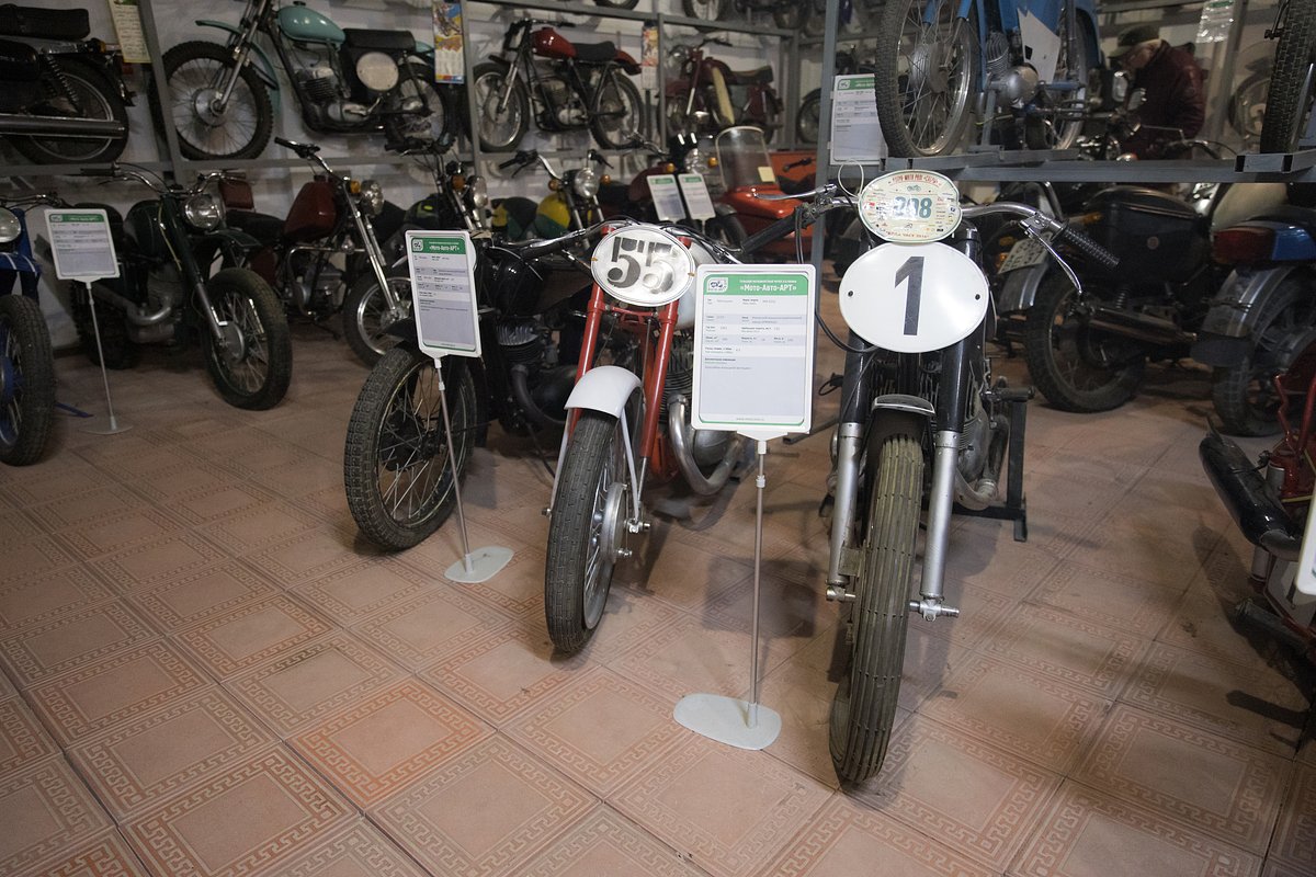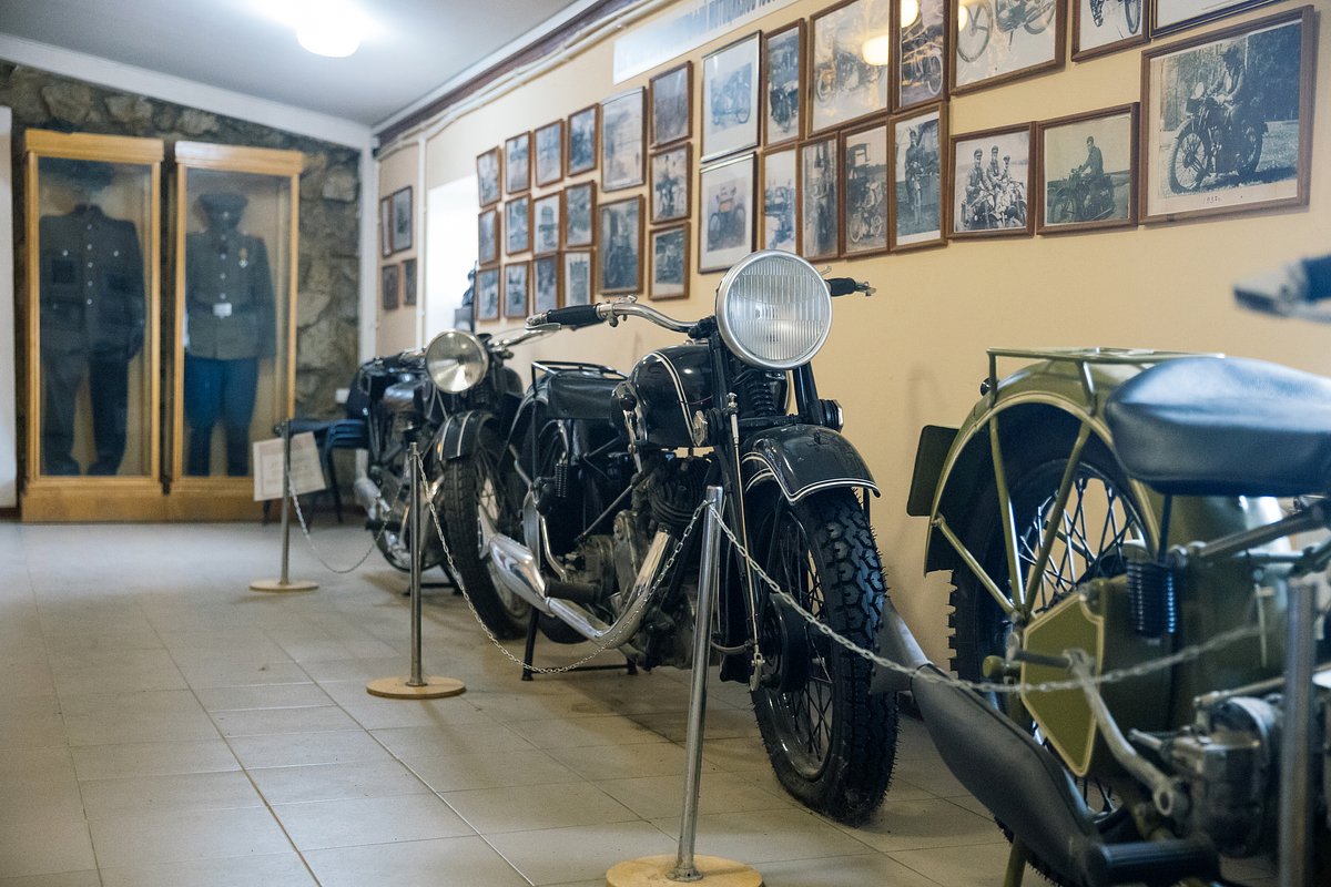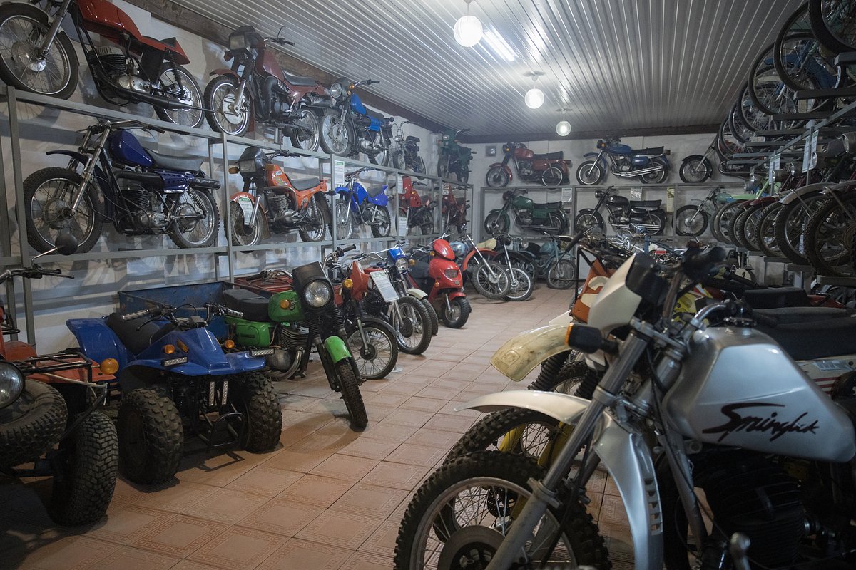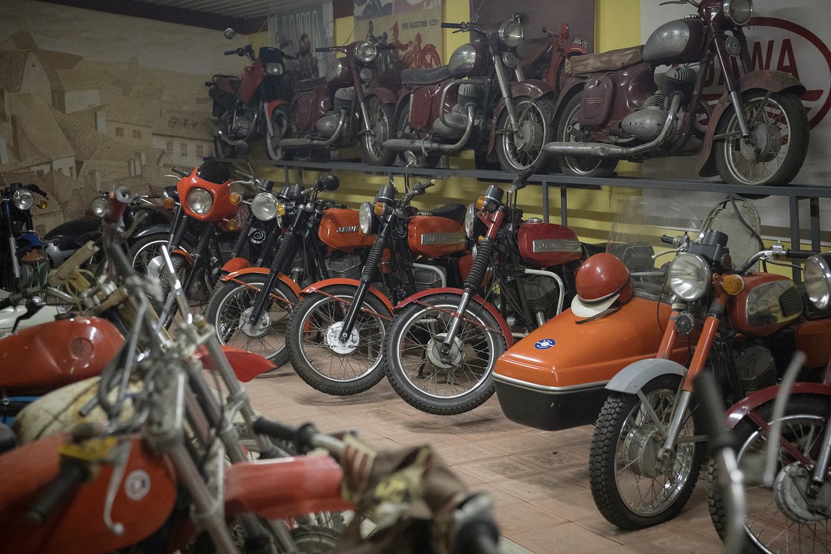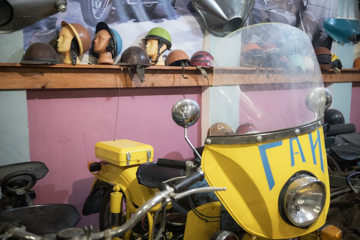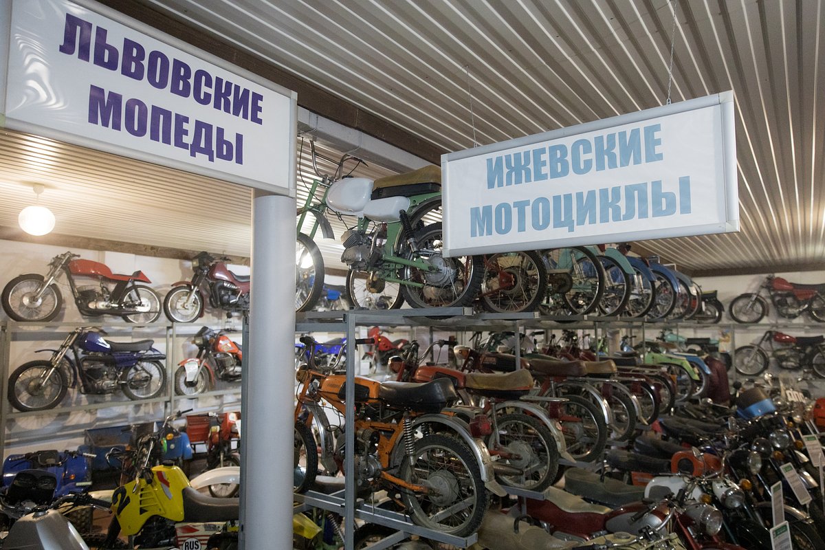 От легендарного тяжелого «Урала» с коляской переходим к немецкому BMW с пулеметом, извлеченному из болота, от него — к армейскому «Харлей-Дэвидсону» WLA-42, любуемся чехословацкой «Явой» — недостижимой мечтой пацанов 1970-х, и вполне достижимыми для них двухскоростными мопедами «Верховина», «Рига» и «Карпаты».