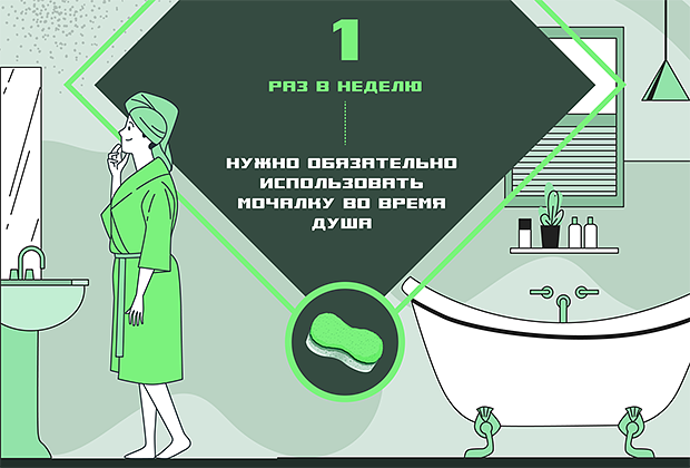 Кожный покров человека в течение недели выделяет порядка 300 граммов сала и 7 литров пота. Их необходимо регулярно смывать, иначе кожа станет идеальным местом для размножения грибков, микробов и других болезнетворных организмов. Чтобы избавиться от сала и пота, каждый день мойтесь теплой водой с мылом или гелем для душа.
