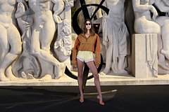 28-летняя манекенщица посетила показ люксового бренда Saint Laurent, который состоялся в рамках Недели моды в Париже. Так, она предстала перед камерами в коричнево-оранжевой толстовке с молнией и открытых красных туфлях. Кроме того, на Бибер были шелковые желтые трусы с белыми кружевами, которые она надела на черные колготки. Внешний вид знаменитости дополнили солнцезащитные очки.