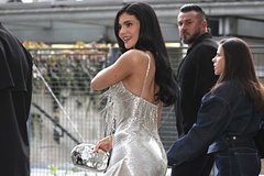 Знаменитость посетила дефиле в серебристом платье, глубокое декольте которого оголяло ее грудь. Наряд также украшали бахрома из страз и высокий разрез на подоле. В руках бизнесвумен держала зеркальный клатч, а в качестве обуви она выбрала блестящие туфли.