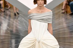 Манекенщица продефилировала в платье без бретелей, верх которого оформлен серебристой тканью, а низ — белым корсетом и юбкой. При этом на размещенных кадрах видно, что нижняя часть наряда также дополнена объемными элементами на боках.
