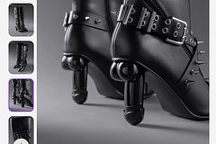 Речь идет о кожаных черных сапогах с каблуком в виде мужских гениталий. Они представлены в двух вариантах — с широким высоким голенищем и шипами. Стоимость первой модели составляет 14 999 рублей, а второй — 17 999.