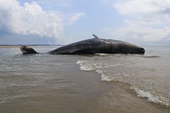 Самку кита вынесло на берег. По ее внешнему виду биологам не удалось определить, что с ней случилось. Ее вес оценивается в 20-25 тонн.
