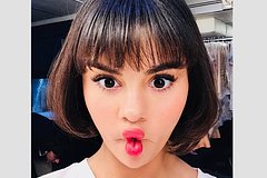 На размещенном снимке знаменитость предстала с короткой стрижкой и челкой. При этом звезда позировала с макияжем, состоящим из накладных ресниц и розовой помады. На кадре видно, что артистка запечатлена в гримерной комнате.