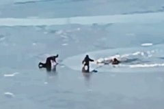 Утопающий схватился за веревку, а морж прыгнул в полынью и стал выталкивать мужчину на лед, вдвоем они вытянули его на берег.