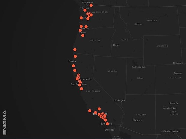 По состоянию на август 2025 года приложение Enigma зарегистрировало более 9000 наблюдений таких объектов в США в радиусе 10 миль (16 километров) от береговых линий и основных водных путей. Примерно в 1500 из этих сообщений упоминаются «вода», «океан», «озеро» или «пляж» и примерно 500 из них произошли в радиусе 5 миль (8 километров) от береговой линии. Больше всего сообщений о НПО поступает из Калифорнии (389) и Флориды (306).