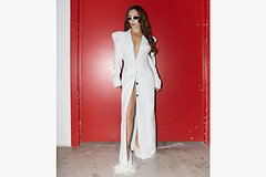 40-летняя исполнительница предстала на размещенном снимке в белом длинном платье-пиджаке с глубоким декольте и экстремальным разрезом в области ног. В то же время она отказалась от бюстгальтера.
