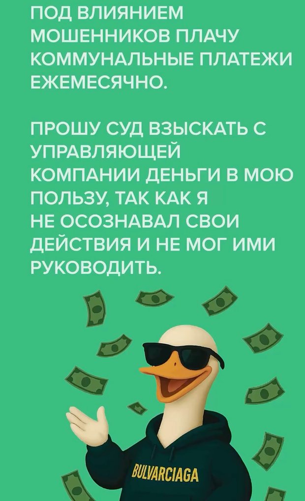 «Под влиянием мошенников потратила 100 тысяч рублей на Wildberries. Прошу суд взыскать с маркетплейса деньги, так как я не осознавала свои действия и не могла ими руководить», «Под влиянием мошенников пять лет платил за учебу. Верните деньги, я не осознавал, что делаю», «Взял кредит и проиграл все в казино, вот готовлю иск и хочу отправить банк в казино», — написали любители мемов.
